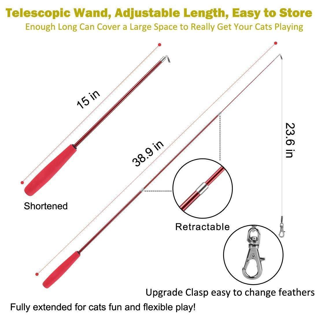 - Interchangeable Feather Attachments: Comes with multiple unique feather toys including natural feathers, plush “worm/snake” toys, and some with integrated bells for auditory stimulation.