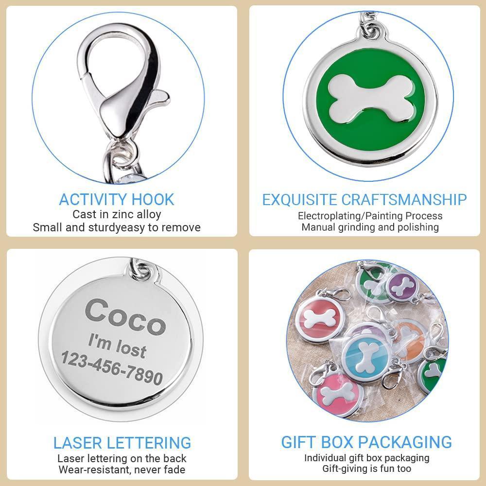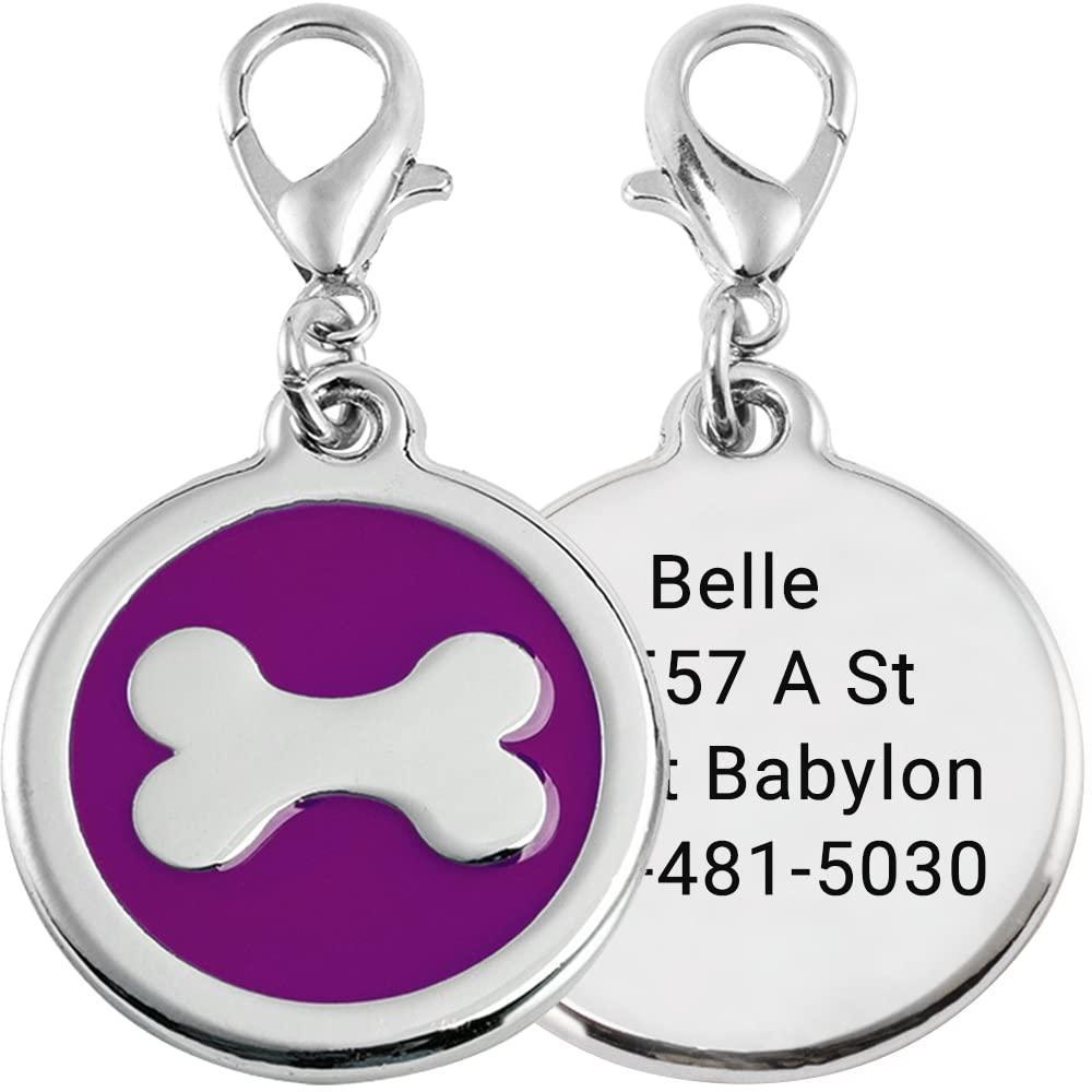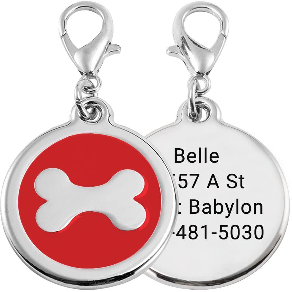 - Design: Round shape with a colored circle on the front having a white bone – shaped cutout or raised design, smooth metal back with laser – engraved text