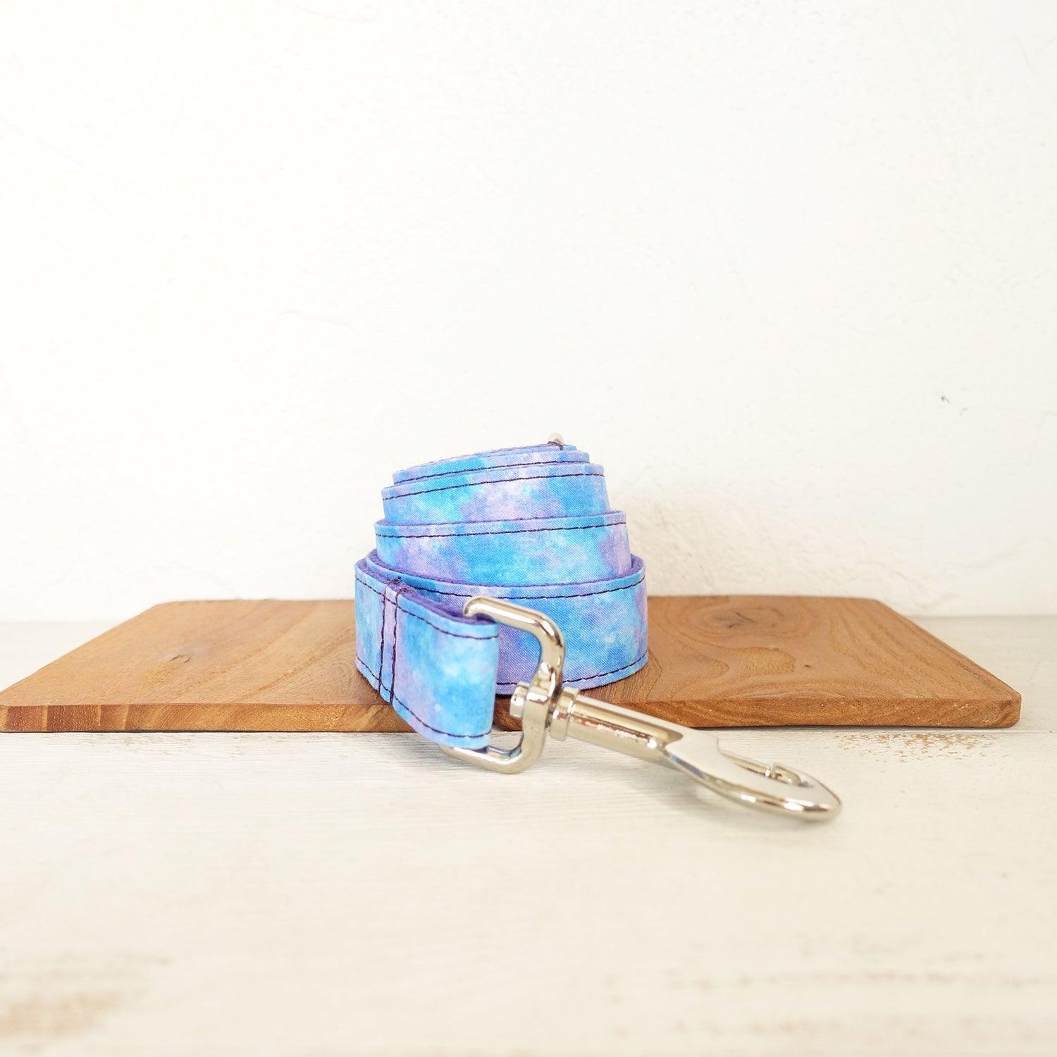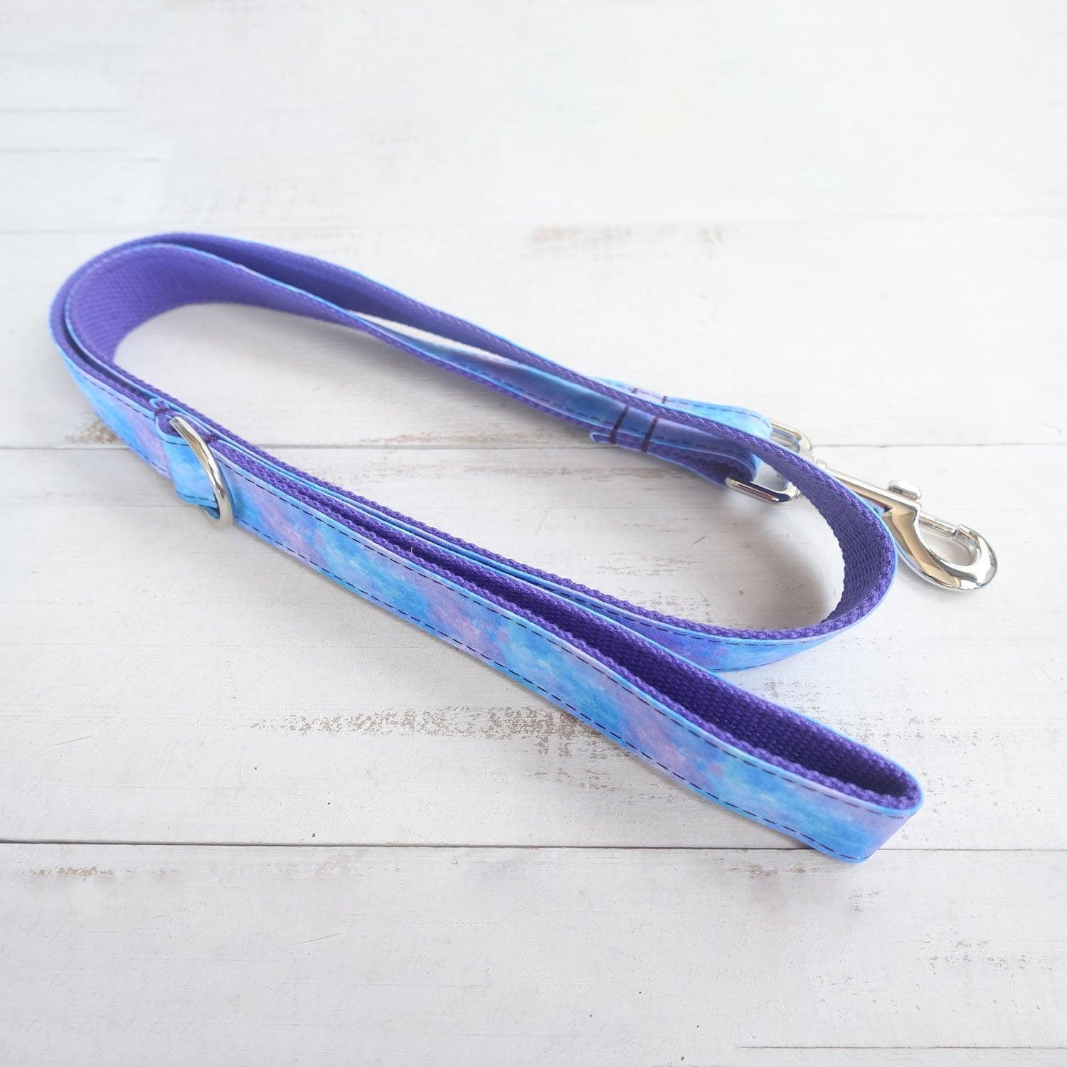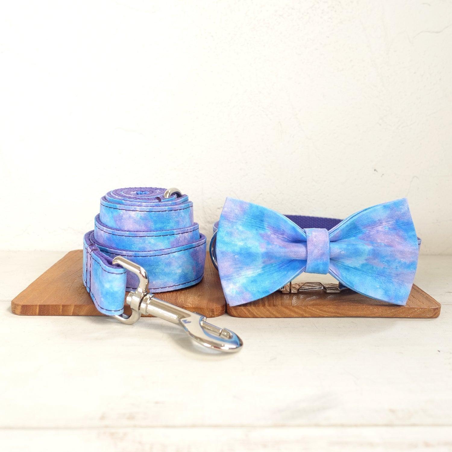 - Design: Blue and purple watercolor/tie – dye pattern with a matching bow tie option