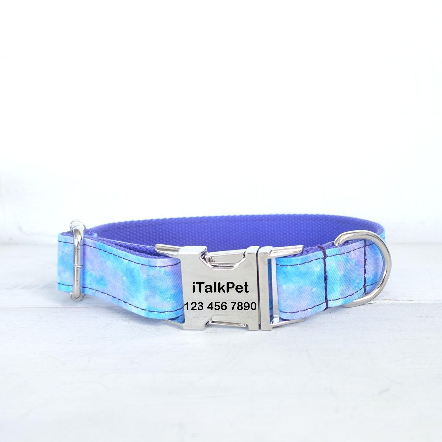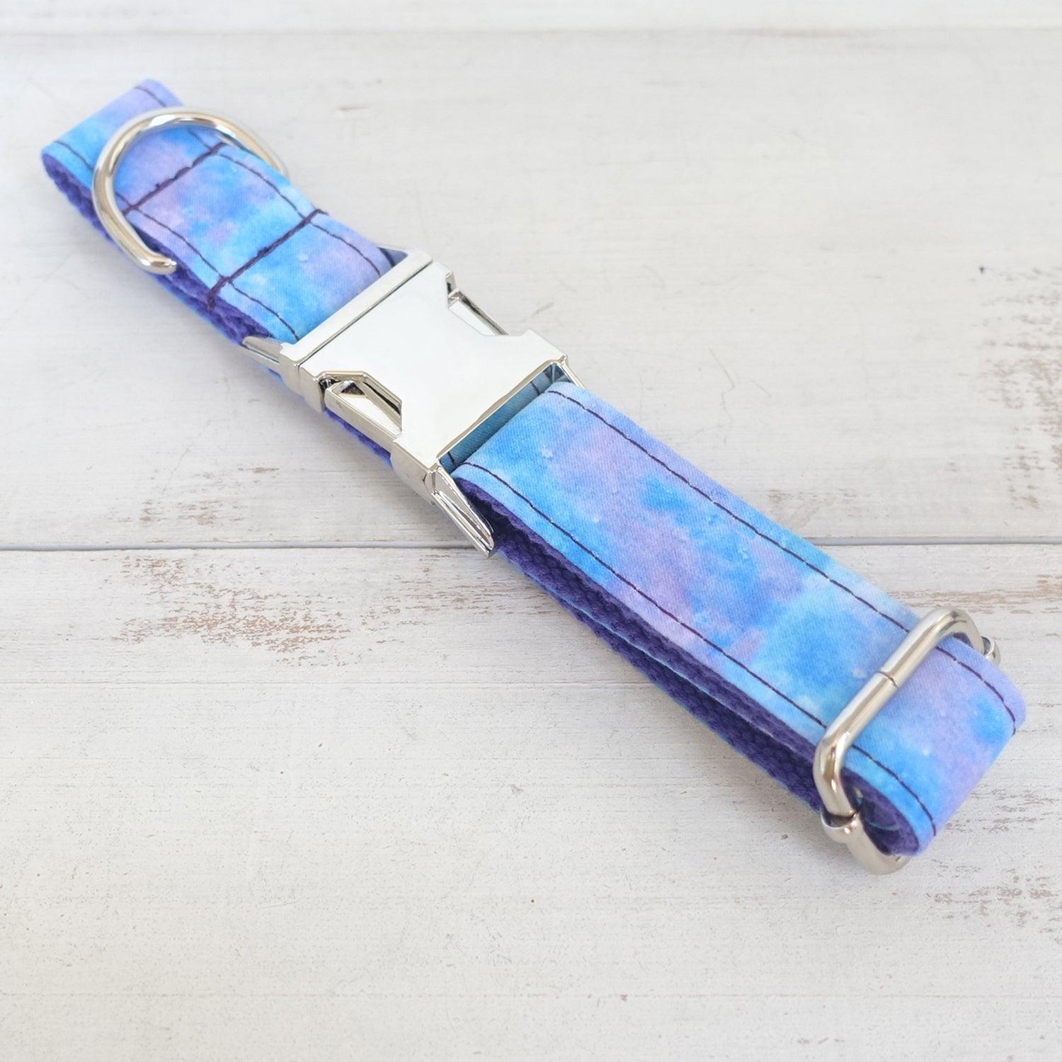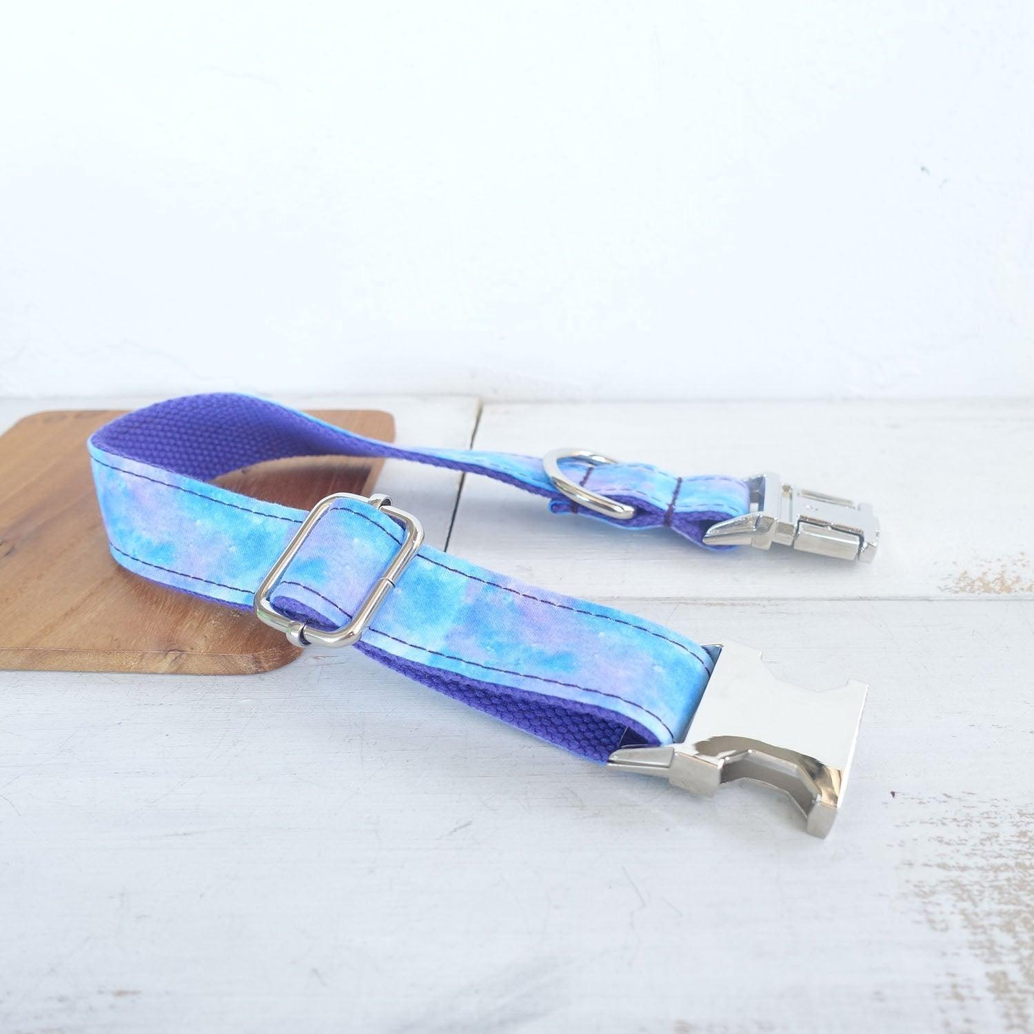 - Design: Blue and purple watercolor/tie – dye pattern with a matching bow tie option