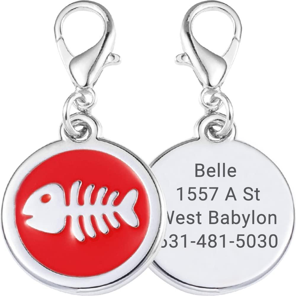 - Design: Circular charm with a raised white fishbone silhouette on a colored enamel background, a silver – toned activity hook, and a flat engraved back