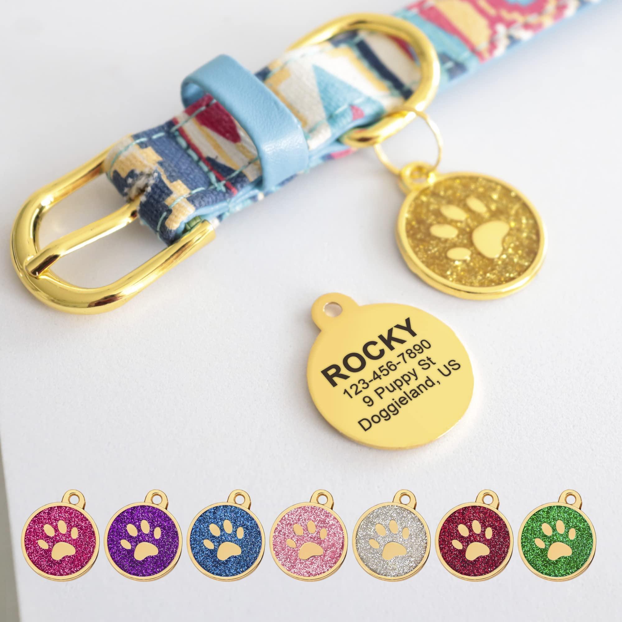 - Design: Circular with a smooth, compact gold frame, a small rectangular tab connecting to a circular gold ring for collar attachment. Glittery background with a raised gold – toned paw print on the front and an engravable smooth gold – toned back.