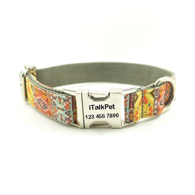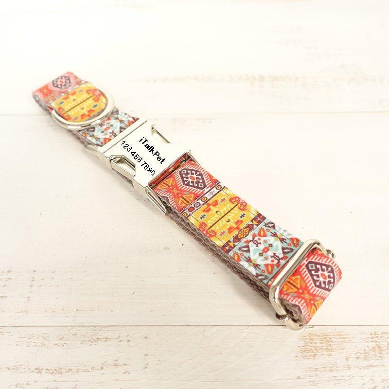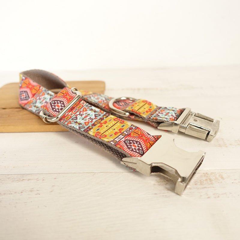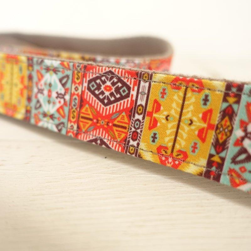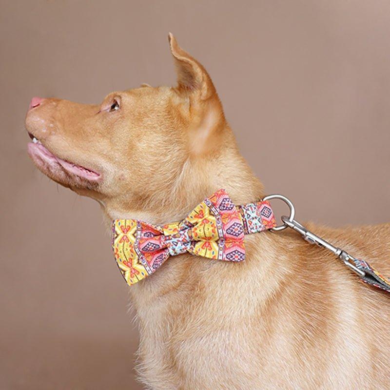 - Design: Ethnic – inspired geometric pattern with tribal/aztec – style motifs. Quick – release metal buckle with a lever mechanism. Detachable bow tie with the same pattern.