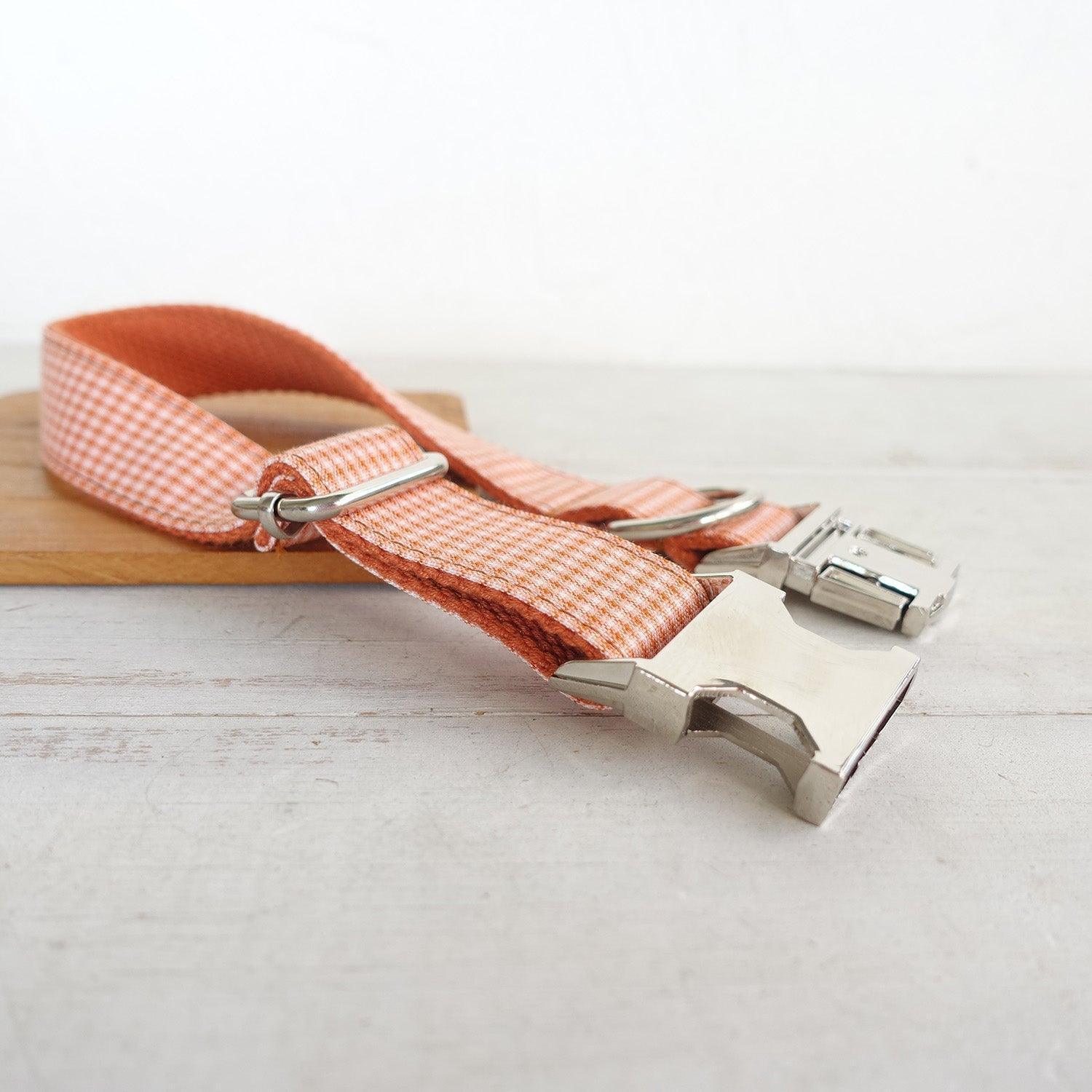 - Design: Structured bow tie attached to the collar, personalized metal plate on the collar, reinforced stitching