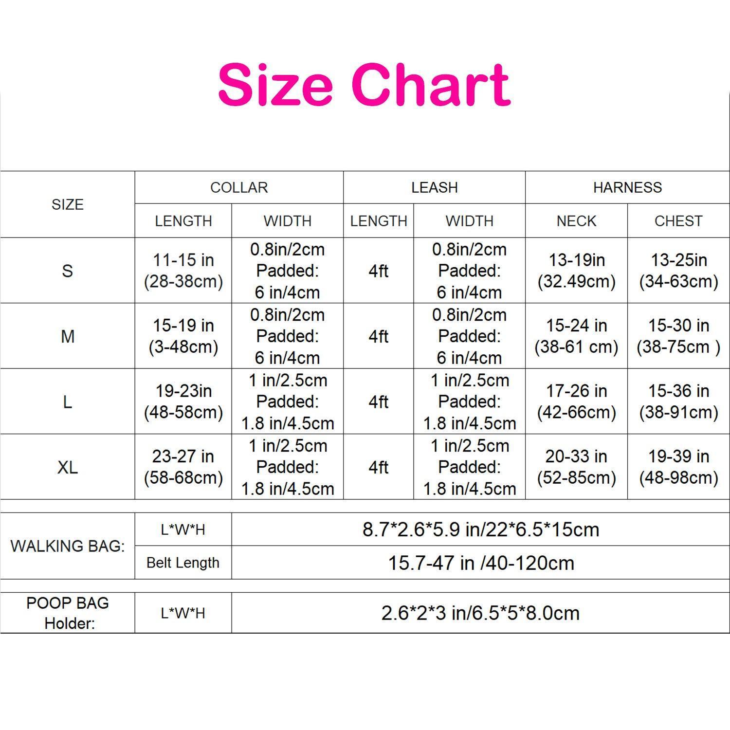 - Adjustability: Length of collar, harness and walking bag belt can be adjusted