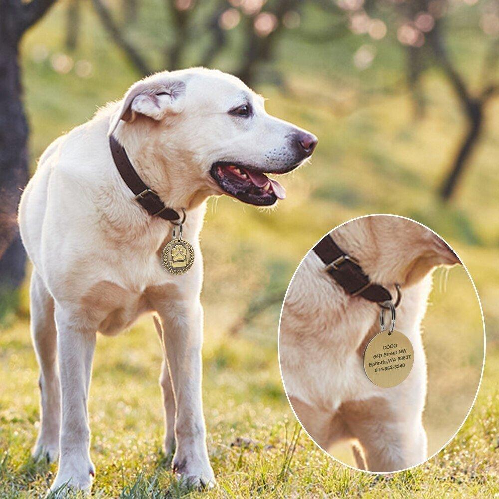 - Design: Circular with a crystal border, colored paw prints, and engraved text