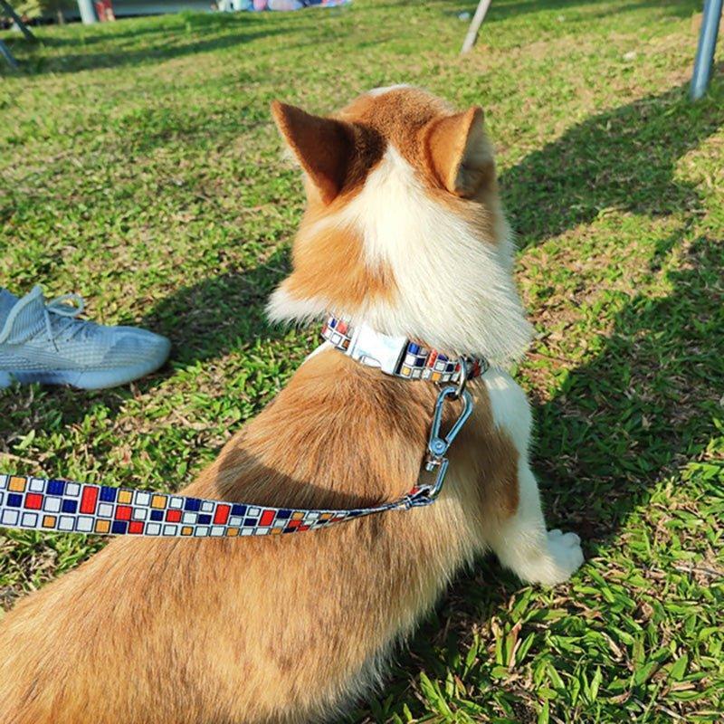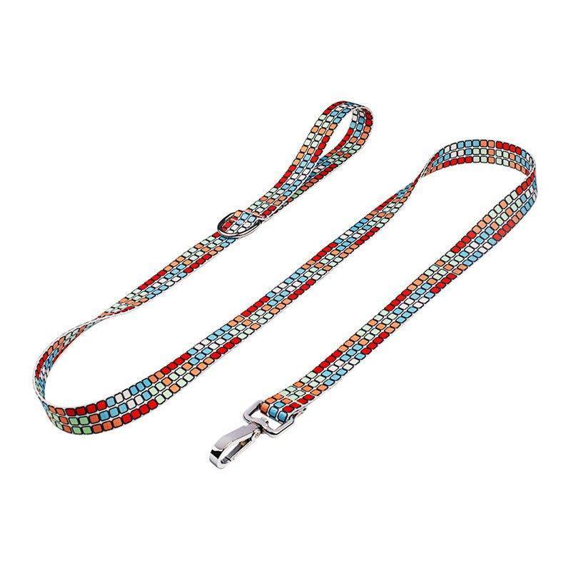 - Leash Design: Flat, rectangular webbing with matching geometric prints, sturdy metal clip, and optional adjustment loop