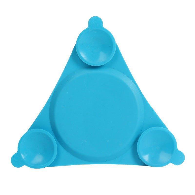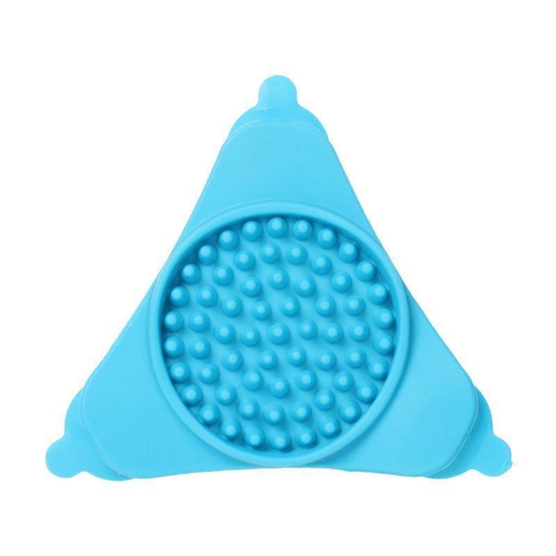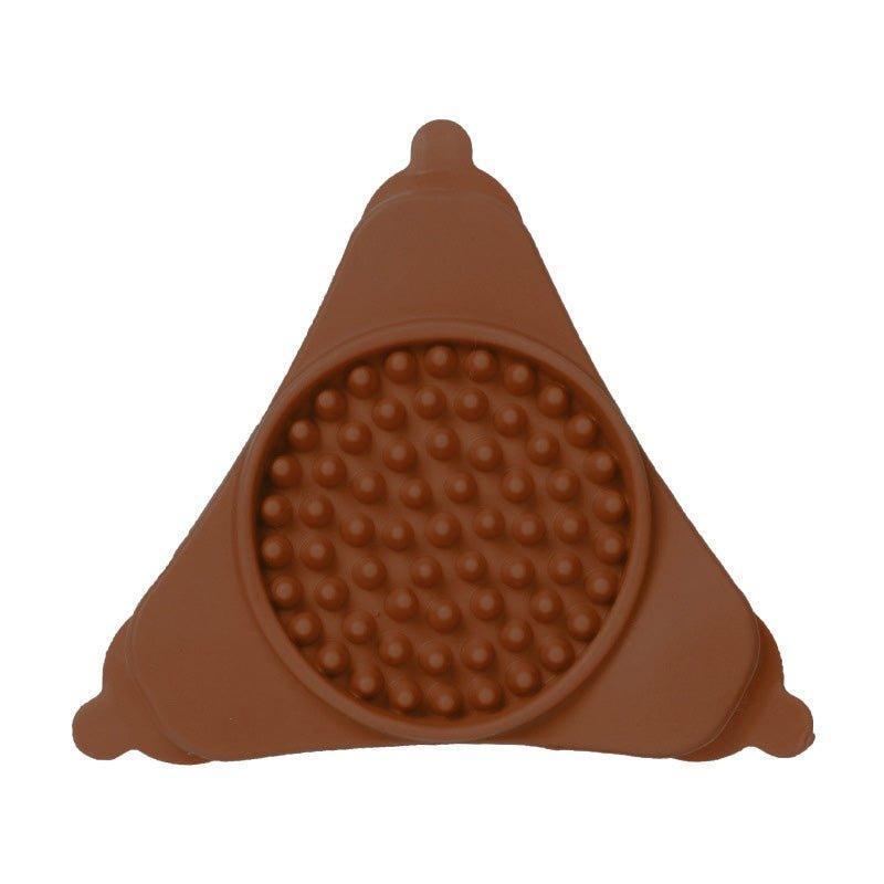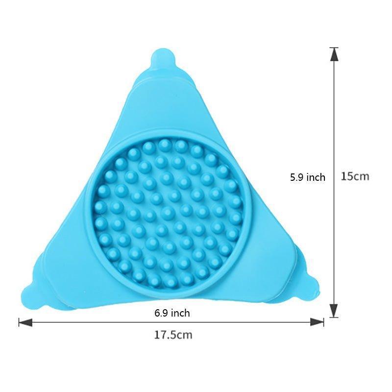- Design: Triangular base with a central circular “licking zone” surrounded by small raised bumps, three small rounded “feet” at the bottom corners, and a small loop/hook at the top for wall – mounting