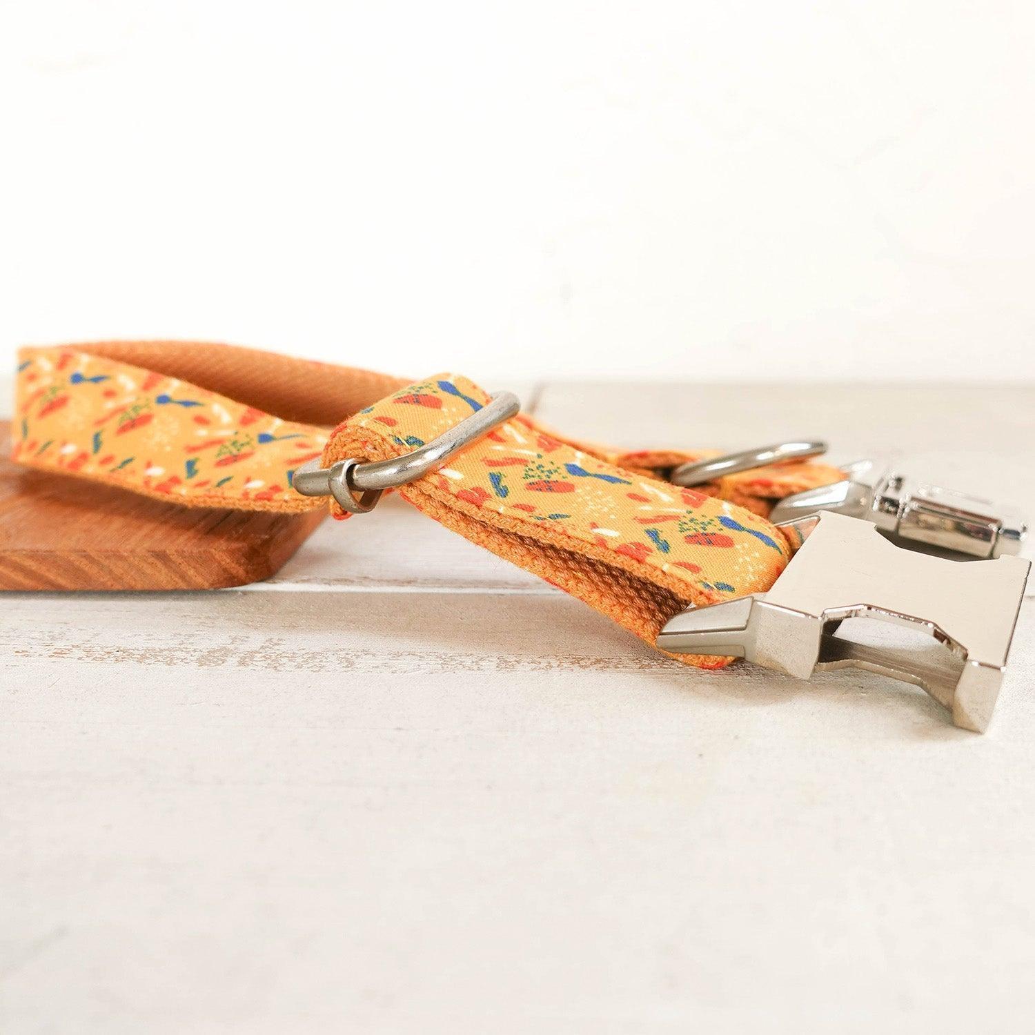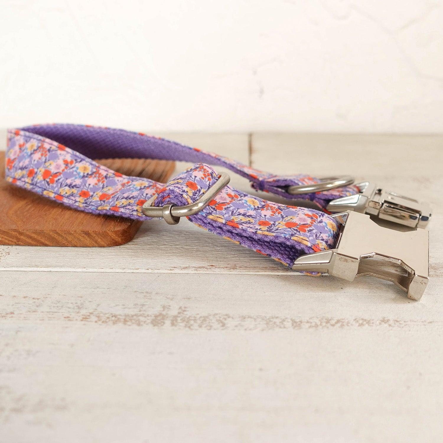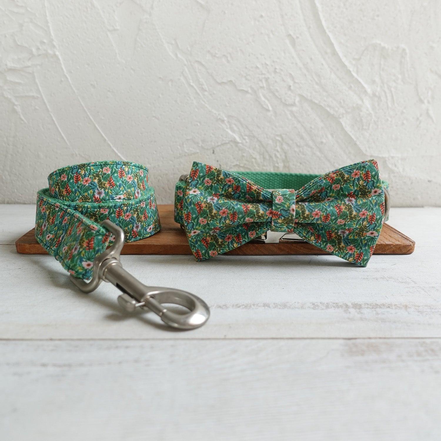 - Design: Collar with adjustable buckle, two D – rings, and reinforced fabric overlay; leash with matching fabric, swivel clasp, and D – ring; bow tie with metal clip