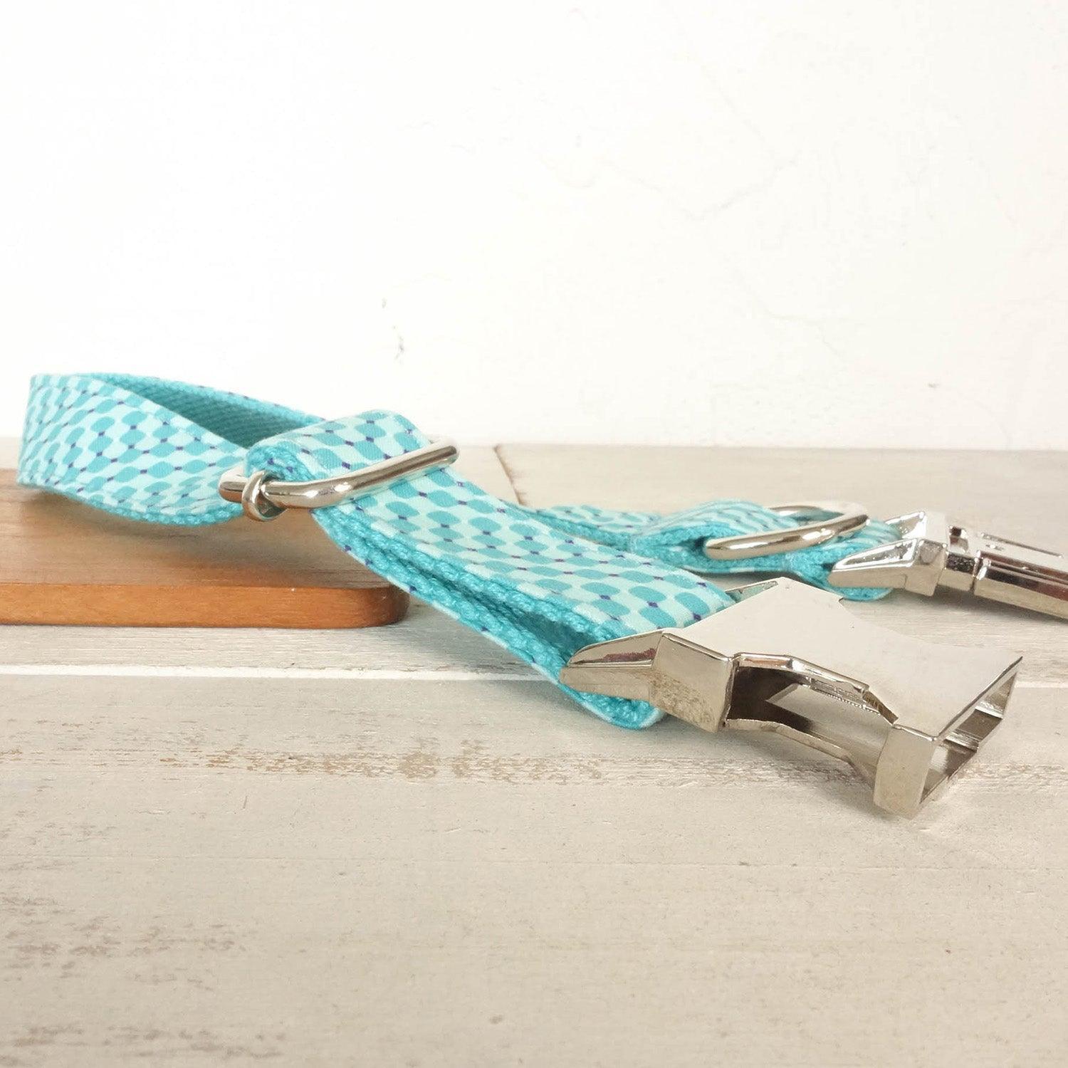 - Material: High density polyester outer with solid turquoise inner webbing, and shiny chrome or stainless – steel metal hardware
