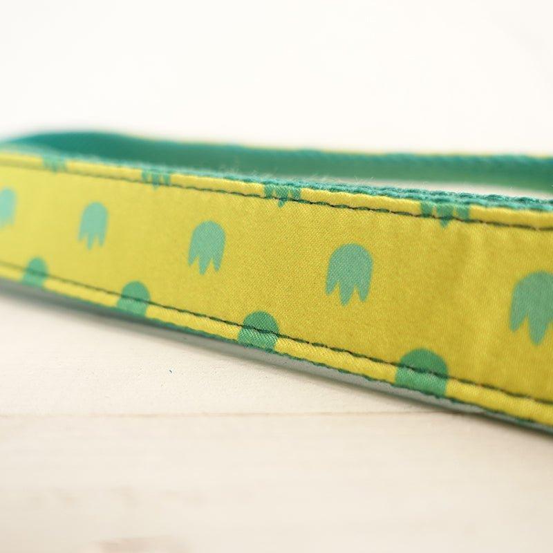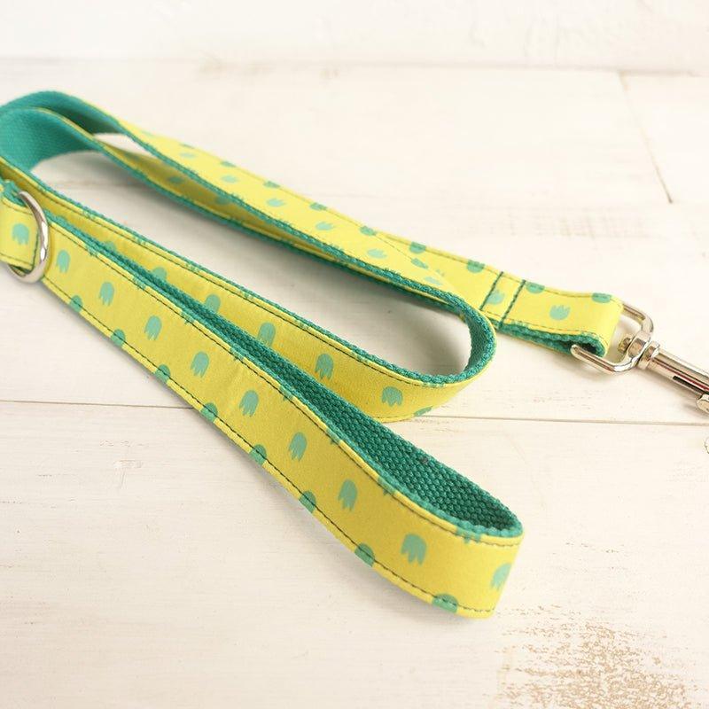 - Pattern: Small, teal, leaf/footprint – shaped motifs printed on the yellow fabric.