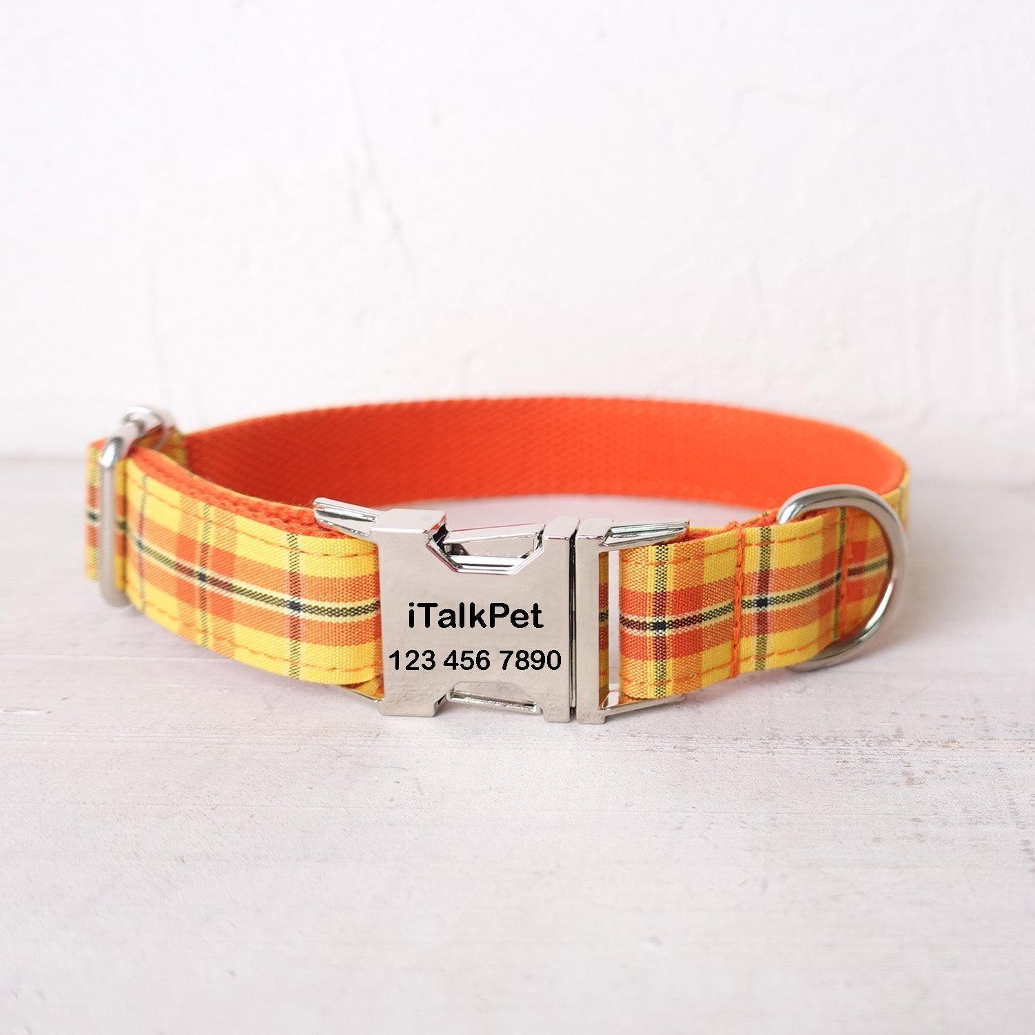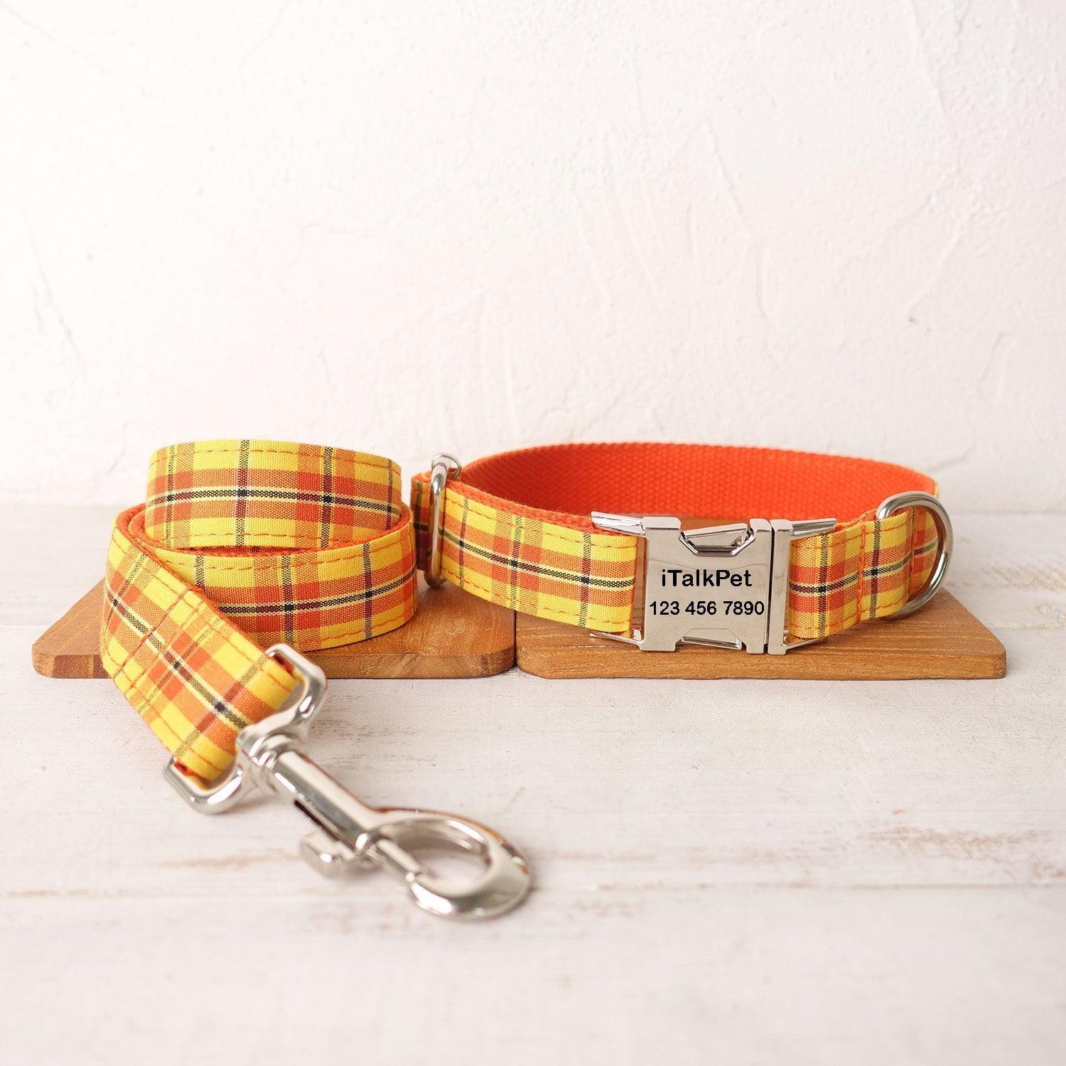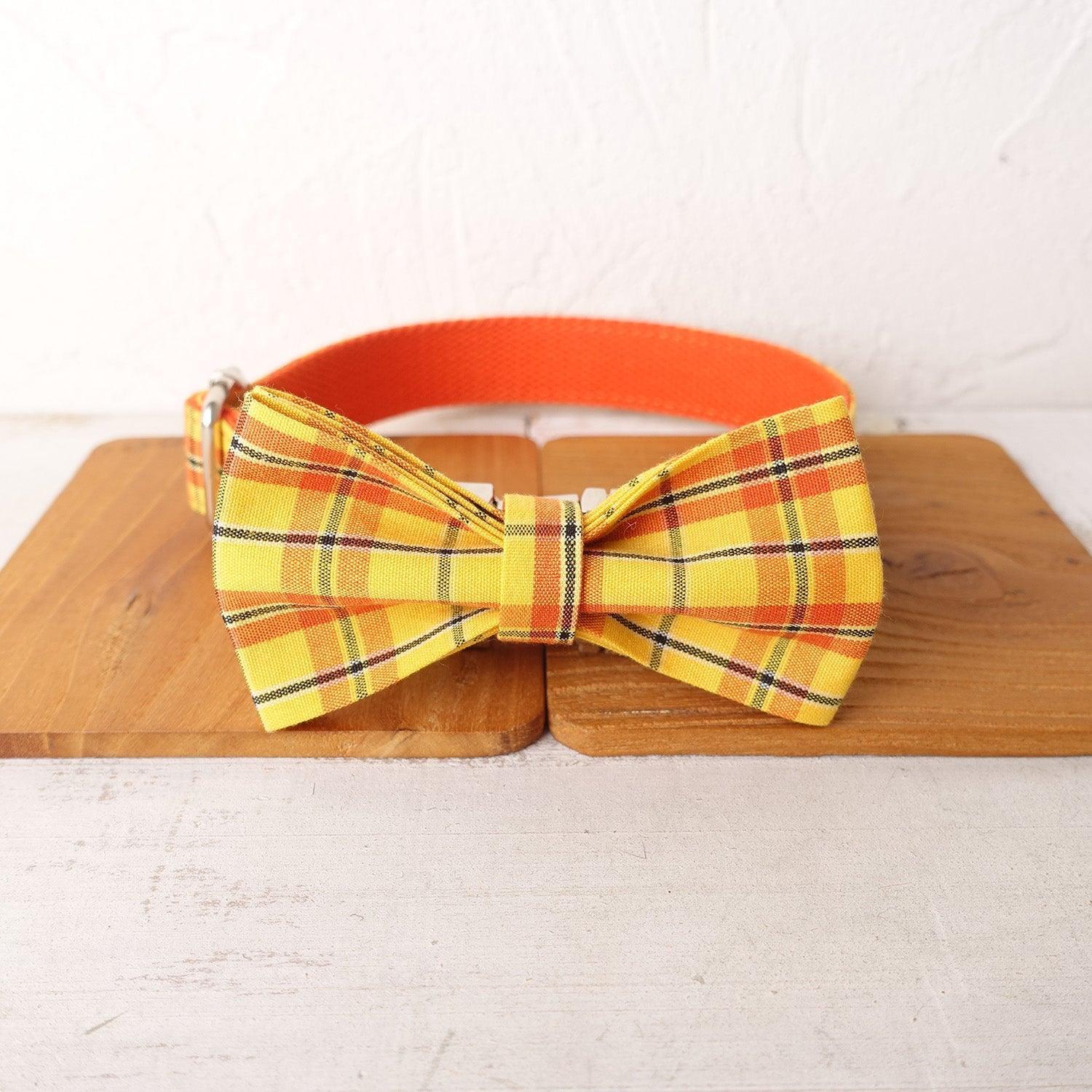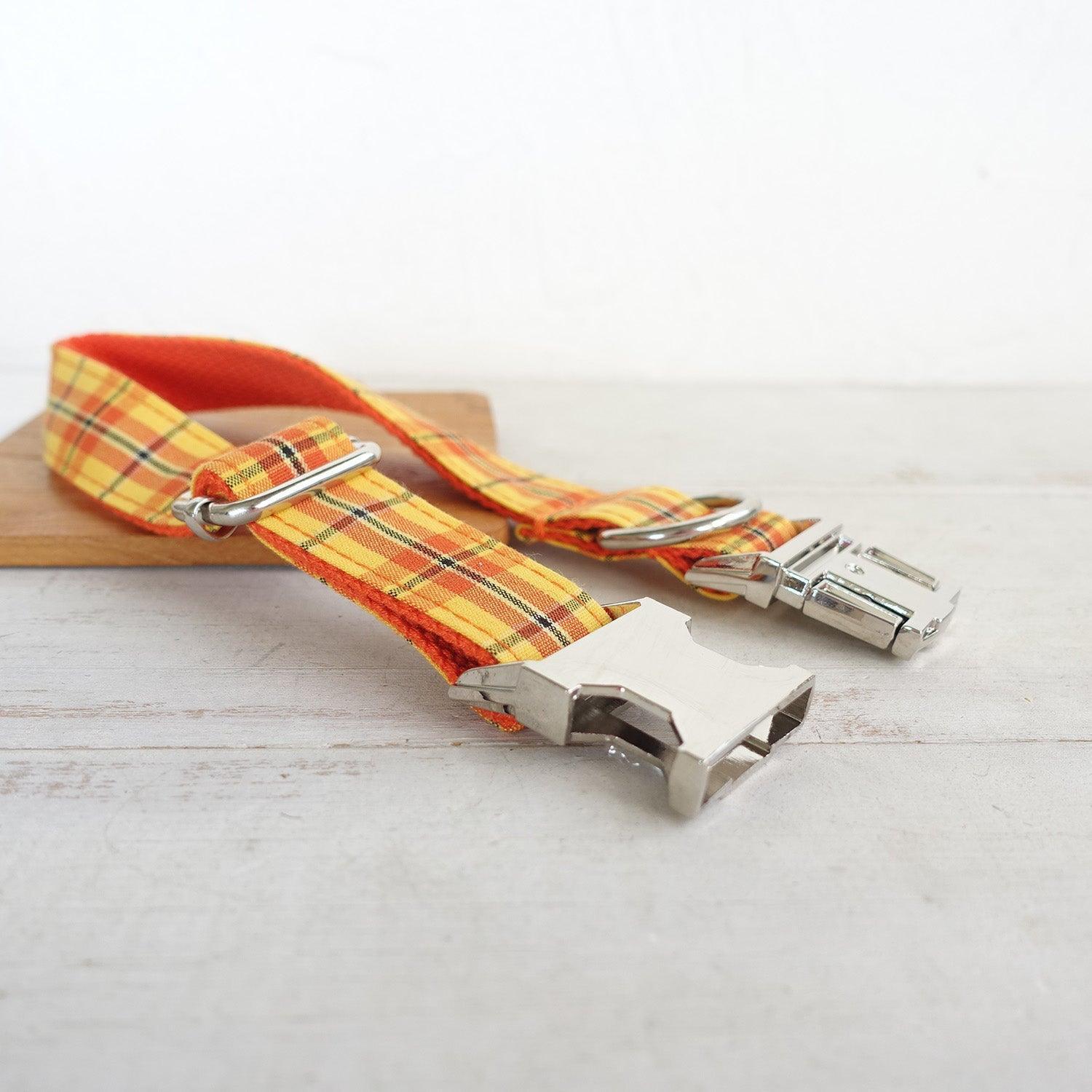- Design: Classic tartan – inspired check pattern, adjustable collar with metal buckle, detachable bow tie